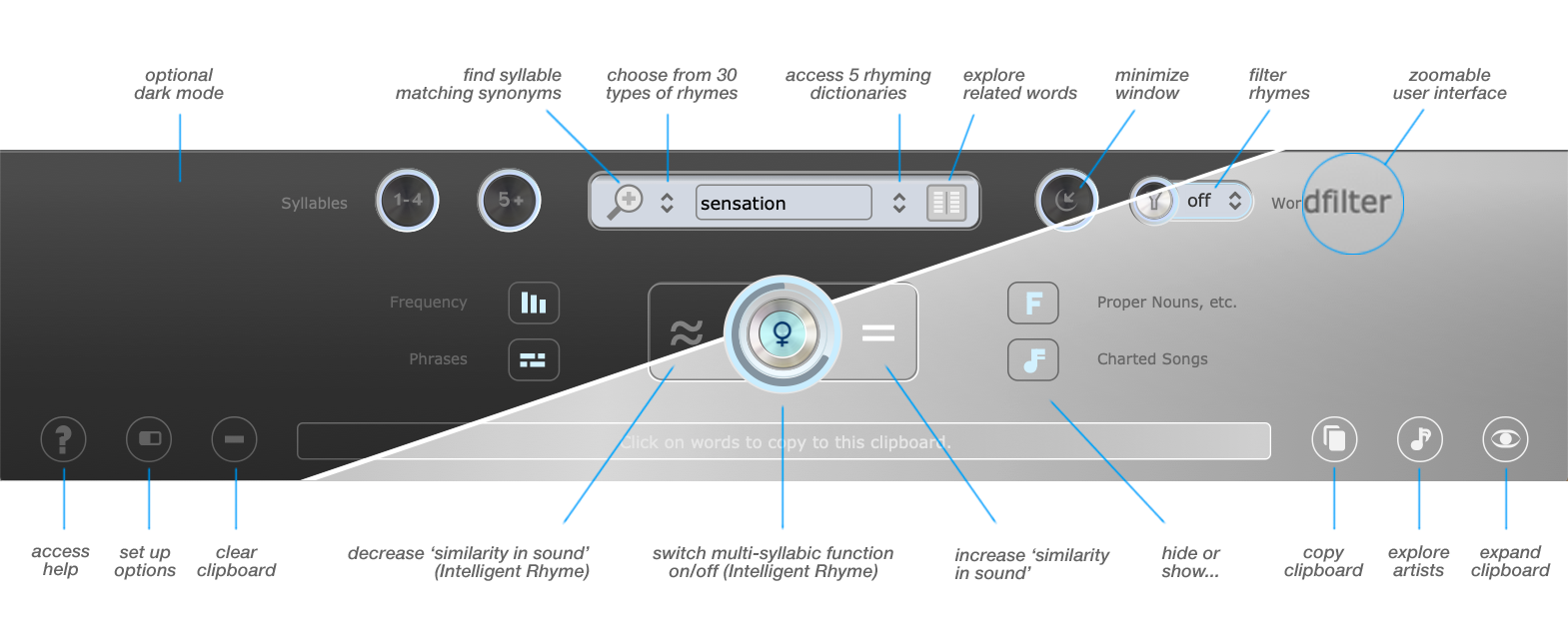 Break free from the limitations of traditional rhyming dictionaries with 30 different types of rhymes: Additive Rhyme (augmented rhyme),